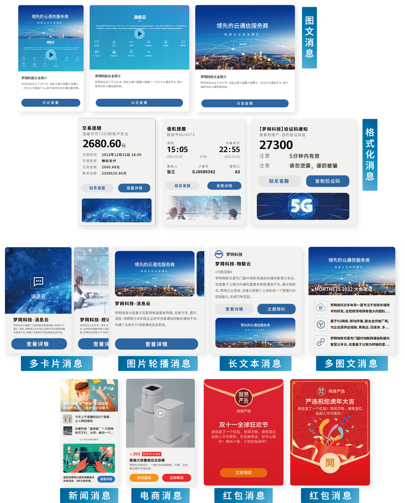 AIM消息将原有行业信息的单一呈现方式升级为多元呈现及多样交互,以丰富的消息模板给用户带来视觉冲击,提升用户体验,同时也满足了企业多样化的营销服务需求,打造全新的全触点营销服务场景。