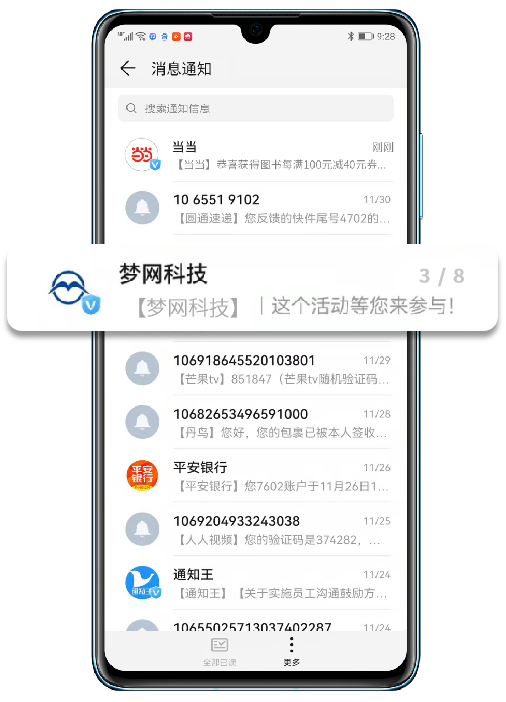 与传统的号段和单一的展现形式不同,在消息页形象展示方面,凯发k8官网科技5G消息解决方案给予包含企业logoV露出及品牌信息植入功能,提高了品牌的社会认知度和用户识别度。而信息界面可自定义企业业务应用模版卡片,式样丰富,实现了用户到H5、小程序等界面的直接跳转,一键直达核心营销页面,让企业在短信收件箱这一营销入口就能带来直观的流量转化,增强客户对公司更信任。
